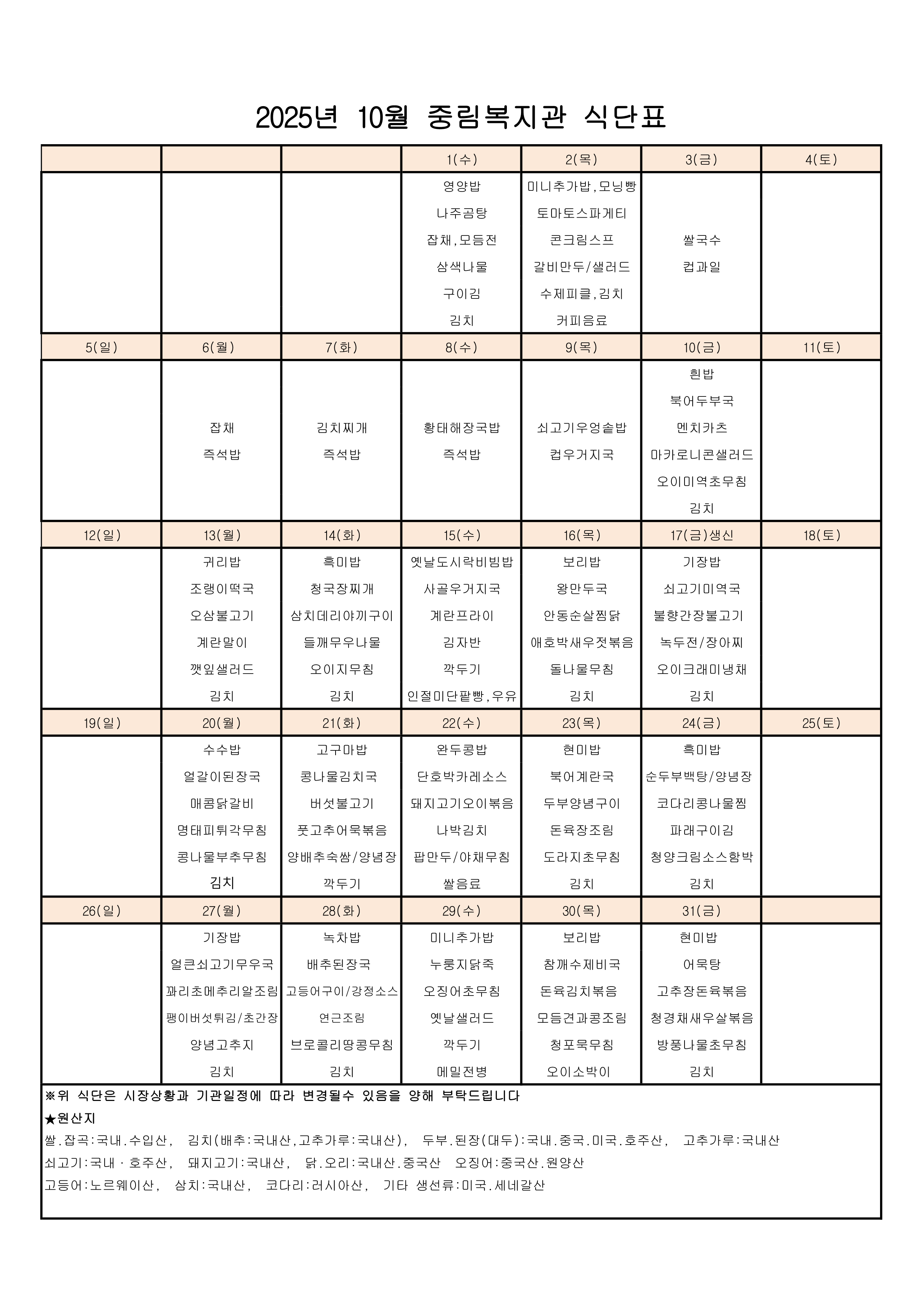10월 식단표 페이지 정보 작성자 관리자 댓글 0건 조회 51회 작성일 25-10-15 09:34 목록 본문 이전글11월 식단표 25.10.29 다음글9월 식단표 25.10.15 댓글 0 댓글목록 등록된 댓글이 없습니다.