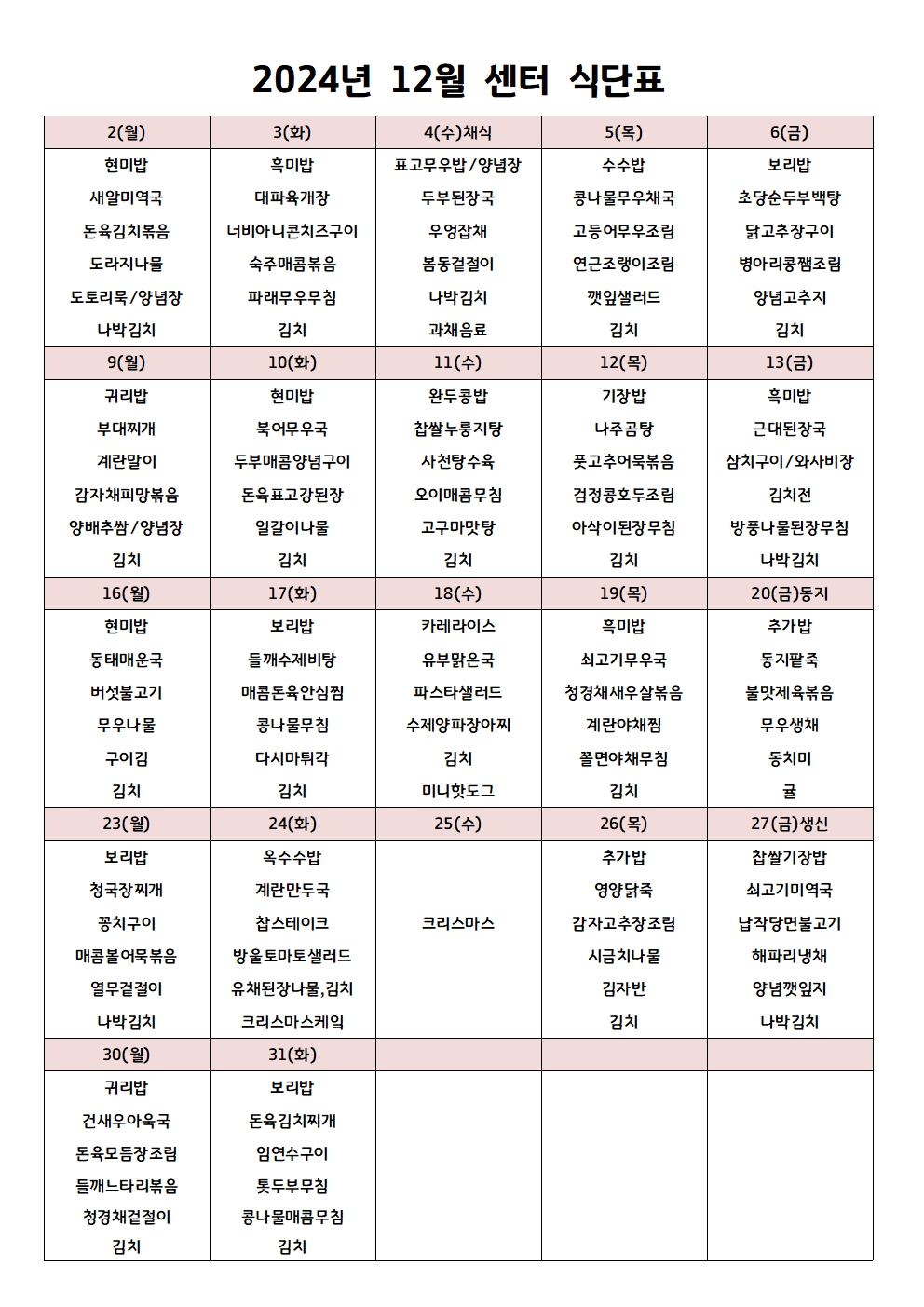 2024년 12월 식단표 페이지 정보 작성자 관리자 댓글 0건 조회 135회 작성일 24-11-29 13:23 목록 본문 이전글2025년 1월 식단표 25.01.10 다음글2024년 11월 식단표 24.10.30 댓글 0 댓글목록 등록된 댓글이 없습니다.