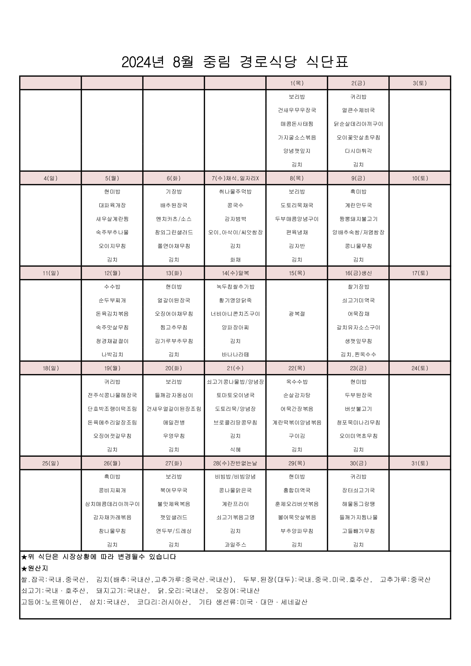 2024년 8월 식단표 페이지 정보 작성자 관리자 댓글 0건 조회 148회 작성일 24-07-30 19:56 목록 본문 이전글2024년 9월 식단표 24.09.02 댓글 0 댓글목록 등록된 댓글이 없습니다.