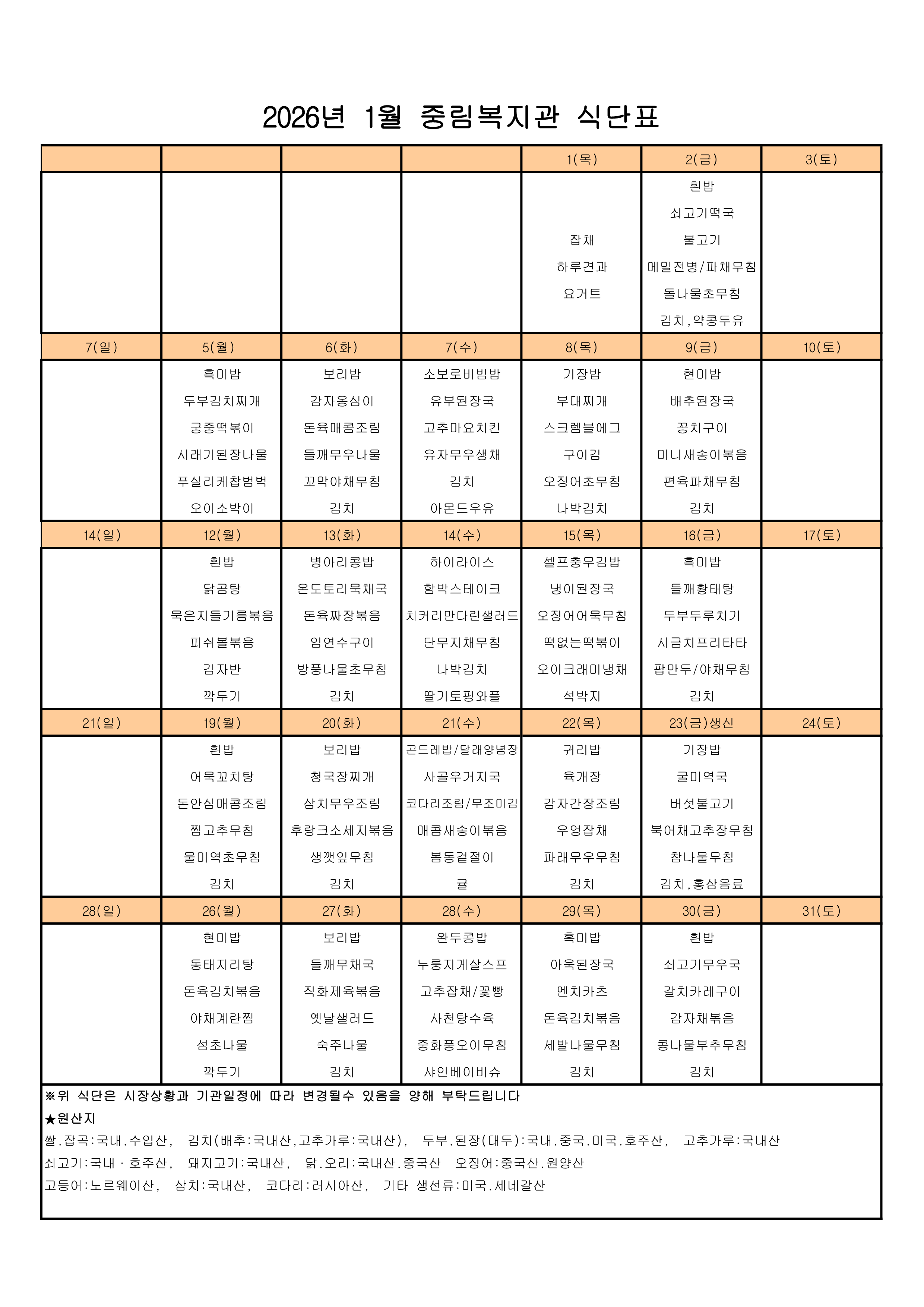 2026년 1월 식단표 페이지 정보 작성자 관리자 댓글 0건 조회 42회 작성일 26-01-12 17:06 목록 본문 이전글2월 식단표 26.02.02 다음글12월 식단표 25.11.28 댓글 0 댓글목록 등록된 댓글이 없습니다.