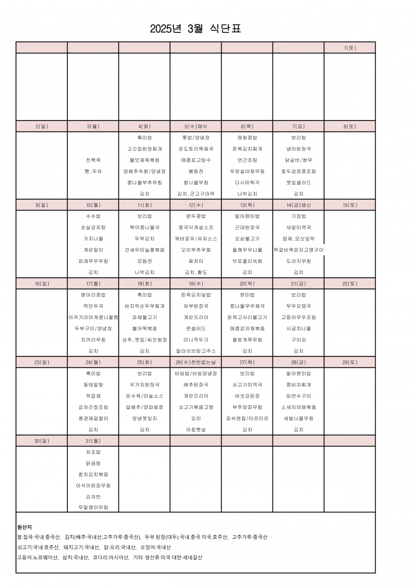 3월 식단표 페이지 정보 작성자 관리자 댓글 0건 조회 118회 작성일 25-03-04 08:37 목록 본문 3월 식단표 이전글4월 식단표 25.03.29 다음글2월 식단표 25.02.03 댓글 0 댓글목록 등록된 댓글이 없습니다.