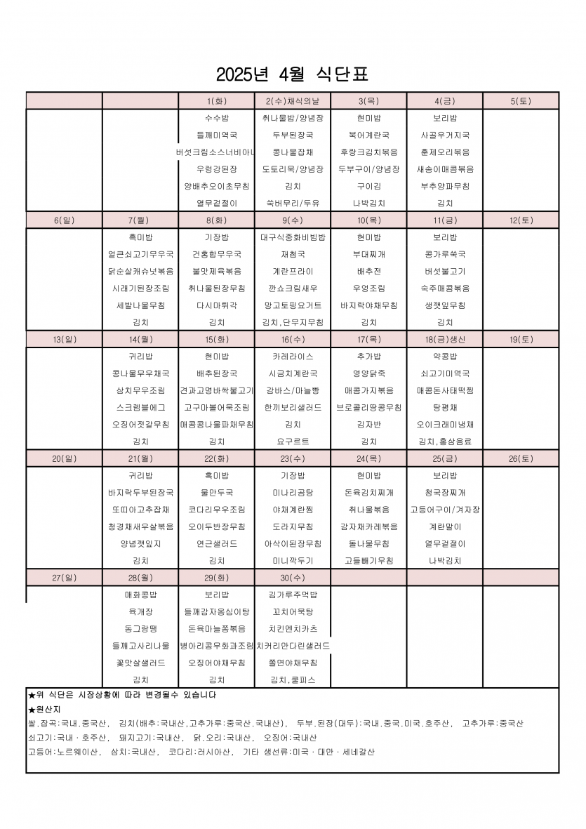4월 식단표 페이지 정보 작성자 관리자 댓글 0건 조회 114회 작성일 25-03-29 15:30 목록 본문 4월 식단표 이전글5월 식단표 25.04.29 다음글3월 식단표 25.03.04 댓글 0 댓글목록 등록된 댓글이 없습니다.