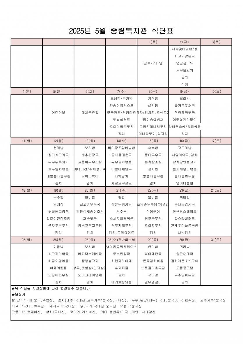 5월 식단표 페이지 정보 작성자 관리자 댓글 0건 조회 137회 작성일 25-04-29 09:29 목록 본문 5월 식단표 이전글6월 식단표 25.06.23 다음글4월 식단표 25.03.29 댓글 0 댓글목록 등록된 댓글이 없습니다.